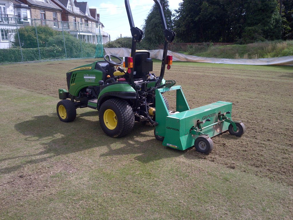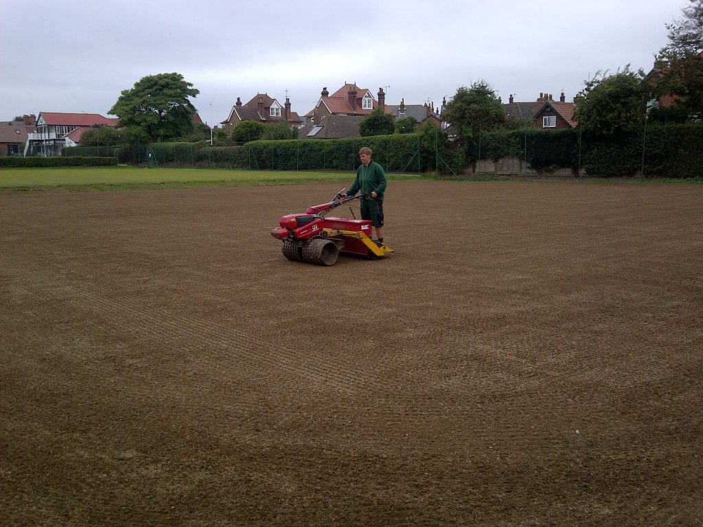 Following this we faze-mowed off courts 5, 6, & 7. This removes all of the vegetation off the surface. Then we graden the courts in 4 directions removing any thatch in the soil. Following this 5T of loam dressing was applied, matted in and seeded with Bar Extreme at 25g per sq/m. and fed with Everris Pre-Seeder at a rate of 40g per sq/m.