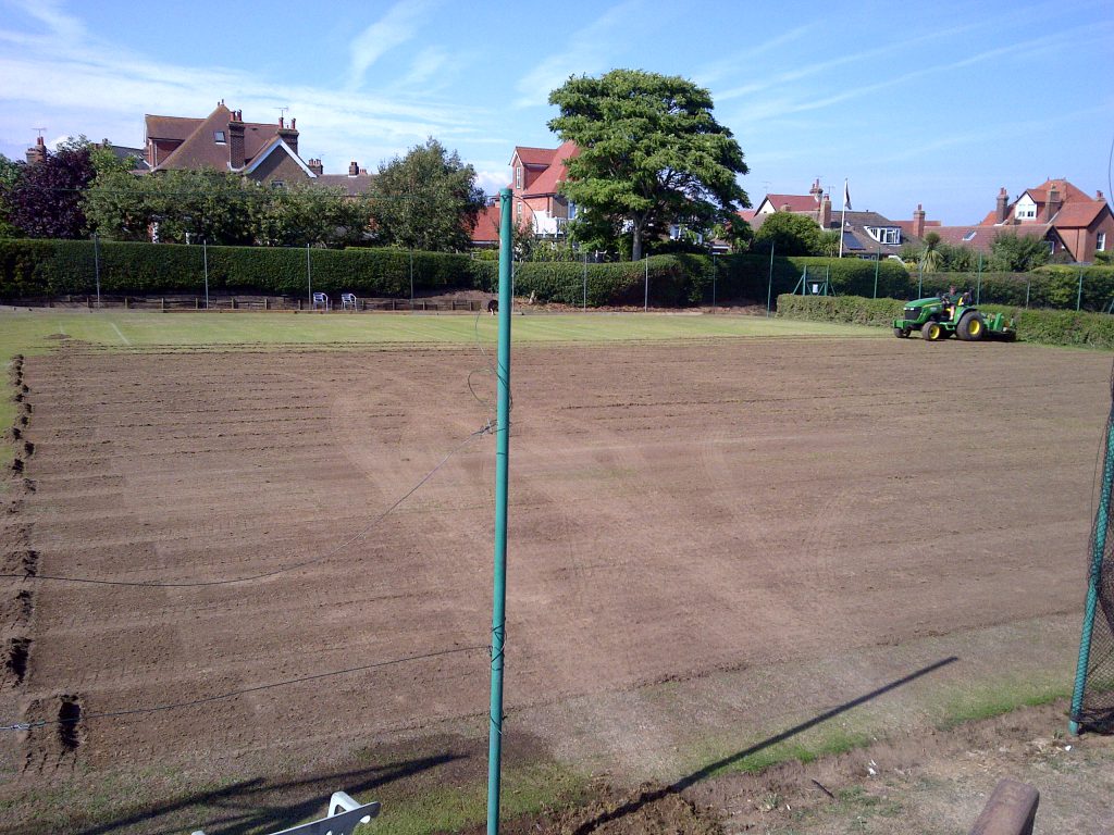 Following this we faze-mowed off courts 5, 6, & 7. This removes all of the vegetation off the surface. Then we graden the courts in 4 directions removing any thatch in the soil. Following this 5T of loam dressing was applied, matted in and seeded with Bar Extreme at 25g per sq/m. and fed with Everris Pre-Seeder at a rate of 40g per sq/m.