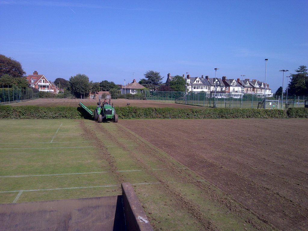 We then powerharrowed the courts to relieve compaction and create tilth for lazer grading. This was done to a 6" depth using a Blecavator.