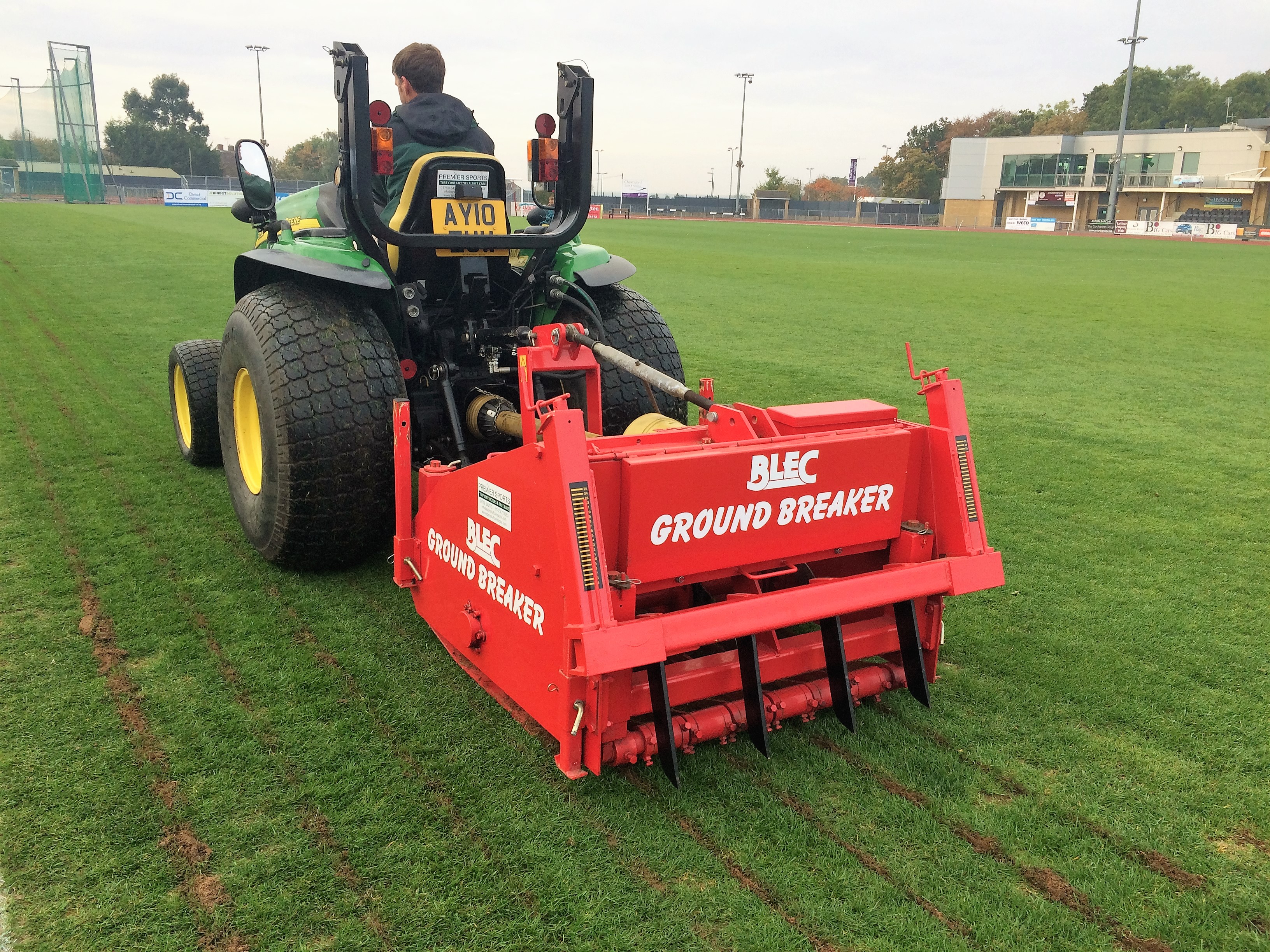 This is another way to aerate the soil, this machine works be cutting a continuous slit from one end of the pitch to the other using knives in a rotating action and decompacting the soil from side to side, very good on hard and compacted ground.